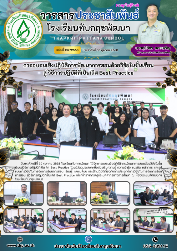วันพฤหัสบดีที่ 30 ตุลาคม 2568 โรงเรียนทับกฤชพัฒนา ได้จัดการอบรมเชิงปฏิบัติการพัฒนาการสอนด้วยวิจัยในชั้นเรียนสู่วิธีการปฏิบัติที่เป็นเลิศ Best Practice โดยมีวัตถุประสงค์เพื่อส่งเสริมความรู้ ความเข้าใจ แนวคิด หลักการ และรูปแบบการวิจัยในการจัดการเรียนการสอน เรียนรู้ แลกเปลี่ยน และฝึกปฏิบัติเกี่ยวกับการประยุกต์การวิจัยในการจัดการเรียนการสอน สู่วิธีการปฏิบัติที่เป็นเลิศ Best Practice ให้แก่ข้าราชการครูและบุคลากรทางการศึกษา ณ ห้องประชุมสัตตบงกช โรงเรียนทับกฤชพัฒนา |