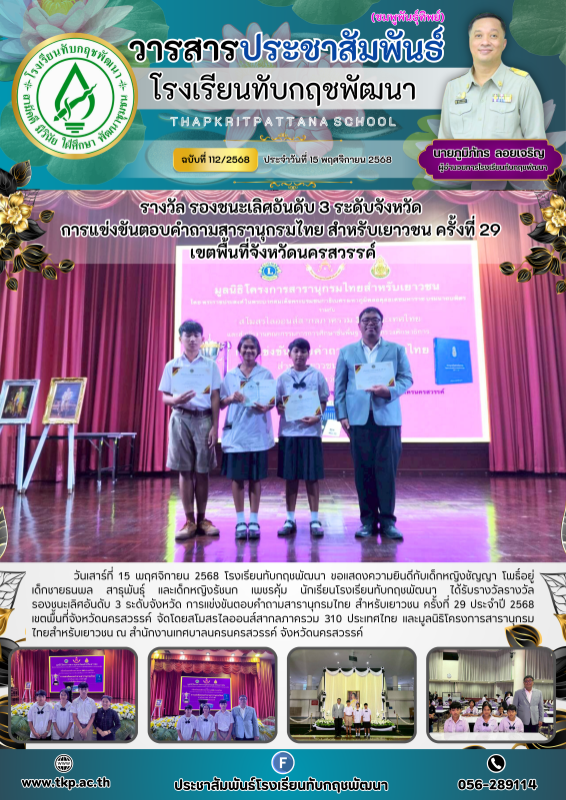 วันเสาร์ที่ 15 พฤศจิกายน 2568 โรงเรียนทับกฤชพัฒนา ขอแสดงความยินดีกับเด็กหญิงชัญญา โพธิ์อยู่ เด็กชายธนพล สาธุพันธุ์ และเด็กหญิงรัชนก เพชรคุ้ม นักเรียนโรงเรียนทับกฤชพัฒนา ได้รับรางวัลรางวัล รองชนะเลิศอันดับ 3 ระดับจังหวัด การแข่งขันตอบคำถามสารานุกรมไทย สำหรับเยาวชน ครั้งที่ 29 ประจำปี 2568 เขตพื้นที่จังหวัดนครสวรรค์ จัดโดยสโมสรไลออนส์สากลภาครวม 310 ประเทศไทย และมูลนิธิโครงการสารานุกรมไทยสำหรับเยาวชน ณ สำนักงานเทศบาลนครนครสวรรค์ จังหวัดนครสวรรค์ |