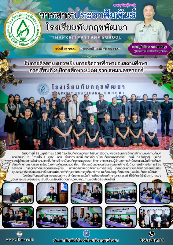 วันอังคารที่ 25 พฤศจิกายน 2568 โรงเรียนทับกฤชพัฒนา ได้รับการติดตาม ตรวจเยี่ยมการจัดการศึกษาของสถานศึกษา ภาคเรียนที่ 2 ปีการศึกษา 2568 จาก สำนักงานเขตพื้นที่การศึกษามัธยมศึกษานครสวรรค์ โดยมี ดร.รังสิวุฒิ พุ่มเกิด รองผู้อำนวยการสำนักงานเขตพื้นที่การศึกษามัธยมศึกษานครสวรรค์ รักษาราชการแทนผู้อำนวยการสำนักงานเขตพื้นที่การศึกษามัธยมศึกษานครสวรรค์ พร้อมด้วยคณะติดตามตรวจเยี่ยม เพื่อประเมินความพร้อมของสถานศึกษาในด้านการบริหารจัดการเรียน การสอน การดูแลความปลอดภัยของผู้เรียน การจัดสภาพแวดล้อมทางการเรียนรู้ ตลอดจนการขับเคลื่อนกิจกรรมส่งเสริมคุณธรรม จริยธรรมของนักเรียนตามนโยบายสำคัญของกระทรวงศึกษาธิการ ณ ห้องประชุมสัตตบงกช โรงเรียนทับกฤชพัฒนา