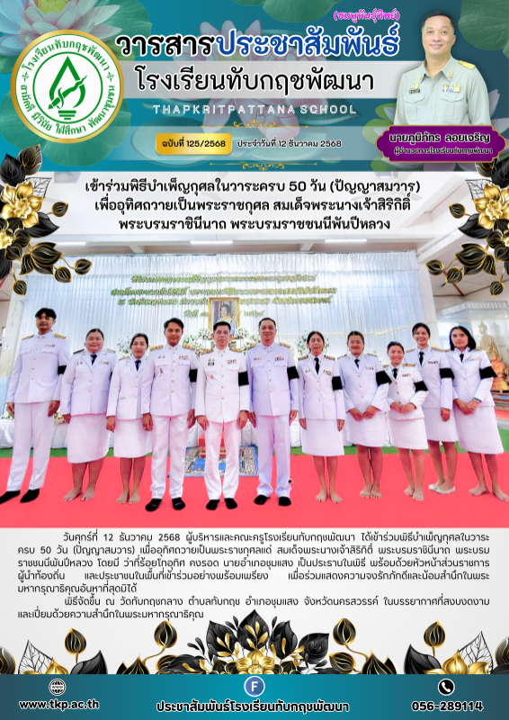 วันศุกร์ที่ 12 ธันวาคม 2568 ผู้บริหารและคณะครูโรงเรียนทับกฤชพัฒนา ได้เข้าร่วมพิธีบำเพ็ญกุศลในวาระ ครบ 50 วัน (ปัญญาสมวาร) เพื่ออุทิศถวายเป็นพระราชกุศลแด่ สมเด็จพระนางเจ้าสิริกิติ์ พระบรมราชินีนาถ พระบรม ราชชนนีพันปีหลวง โดยมี ว่าที่ร้อยโทอุทิศ คงรอด นายอำเภอชุมแสง เป็นประธานในพิธี พร้อมด้วยหัวหน้าส่วนราชการ ผู้นำท้องถิ่น และประชาชนในพื้นที่เข้าร่วมอย่างพร้อมเพรียง เพื่อร่วมแสดงความจงรักภักดีและน้อมสำนึกในพระมหากรุณาธิคุณอันหาที่สุดมิได้ พิธีจัดขึ้น ณ วัดทับกฤชกลาง ตำบลทับกฤช อำเภอชุมแสง จังหวัดนครสวรรค์ ในบรรยากาศที่สงบงดงาม และเปี่ยมด้วยความสำนึกในพระมหากรุณาธิคุณ |