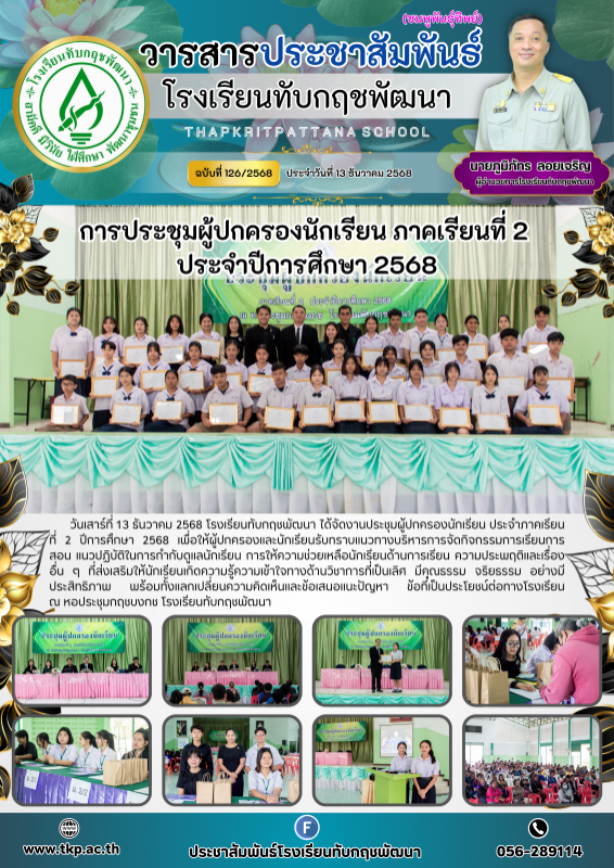 วันเสาร์ที่ 13 ธันวาคม 2568 โรงเรียนทับกฤชพัฒนา ได้จัดงานประชุมผู้ปกครองนักเรียน ประจำภาคเรียนที่ 2 ปีการศึกษา 2568 เพื่อให้ผู้ปกครองและนักเรียนรับทราบเเนวทางบริหารการจัดกิจกรรมการเรียนการสอน เเนวปฏิบัติในการกำกับดูแลนักเรียน การให้ความช่วยเหลือนักเรียนด้านการเรียน ความประพฤติและเรื่องอื่น ๆ ที่ส่งเสริมให้นักเรียนเกิดความรู้ความเข้าใจทางด้านวิชาการที่เป็นเลิศ มีคุณธรรม จริยธรรม อย่างมีประสิทธิภาพ พร้อมทั้งแลกเปลี่ยนความคิดเห็นและข้อเสนอแนะปัญหา ข้อที่เป็นประโยชน์ต่อทางโรงเรียน ณ หอประชุมกฤชบงกช โรงเรียนทับกฤชพัฒนา |