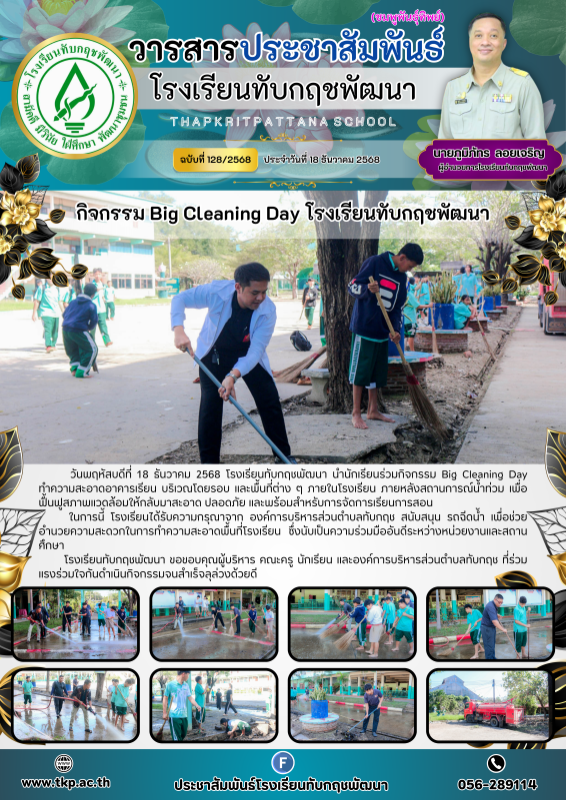 วันพฤหัสบดีที่ 18 ธันวาคม 2568 โรงเรียนทับกฤชพัฒนา นำนักเรียนร่วมกิจกรรม Big Cleaning Day ทำความสะอาดอาคารเรียน บริเวณโดยรอบ และพื้นที่ต่าง ๆ ภายในโรงเรียน ภายหลังสถานการณ์น้ำท่วม เพื่อฟื้นฟูสภาพแวดล้อมให้กลับมาสะอาด ปลอดภัย และพร้อมสำหรับการจัดการเรียนการสอน