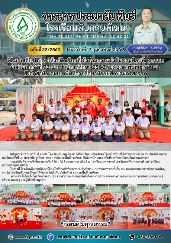 วันอังคารที่ 17 กุมภาพันธ์ 2569 โรงเรียนทับกฤชพัฒนา ได้จัดพิธีมอบเกียรติบัตรให้แก่นักเรียนที่เข้าร่วมการแข่งขัน งานศิลปหัตถกรรมนักเรียน ครั้งที่ 73 ประจำปีการศึกษา 2568 ระดับเขตพื้นที่การศึกษา สังกัดสำนักงานเขตพื้นที่การศึกษามัธยมศึกษานครสวรรค์