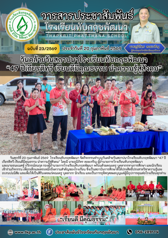 วันศุกร์ที่ 20 กุมภาพันธ์ 2569 โรงเรียนทับกฤชพัฒนา จัดกิจกรรมทำบุญวันคล้ายวันสถาปนาโรงเรียนทับกฤชพัฒนา ครบรอบ 47 ปี โดยมี นายภูมิภัทร ลอยเจริญ ผู้อำนวยการโรงเรียนทับกฤชพัฒนา และนายธนะเมศฐ์ กวีกรณ์ธนกุล รองผู้อำนวยการโรงเรียนทับกฤชพัฒนา พร้อมด้วยคณะครู บุคลากรทางการศึกษา และนักเรียน เข้าร่วมกิจกรรม เพื่อระลึกและตระหนักถึงความสำคัญของโรงเรียน ซึ่งเป็นสถาบันการศึกษาที่ได้ประสิทธิ์ประสาทวิชาความรู้และอบรมบ่มนิสัย และเพื่อให้เป็นสิริมงคลแก่คณะครู บุคลากร นักเรียน และเป็นการอุทิศกุศลผลบุญแด่ผู้มีอุปการคุณต่อโรงเรียนทุกท่าน |