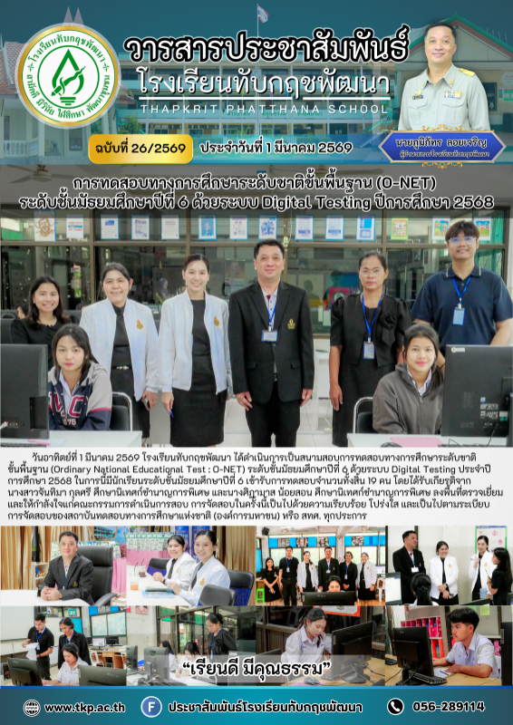 วันอาทิตย์ที่ 1 มีนาคม 2569 โรงเรียนทับกฤชพัฒนา ได้ดำเนินการเป็นสนามสอบการทดสอบทางการศึกษาระดับชาติขั้นพื้นฐาน (Ordinary National Educational Test : O-NET) ระดับชั้นมัธยมศึกษาปีที่ 6 ด้วยระบบ Digital Testing ประจำปีการศึกษา 2568 ในการนี้มีนักเรียนระดับชั้นมัธยมศึกษาปีที่ 6 เข้ารับการทดสอบจำนวนทั้งสิ้น 19 คน โดยได้รับเกียรติจากนางสาวจันทิมา กุลศรี ศึกษานิเทศก์ชำนาญการพิเศษ และนางศิฏามาส น้อยสอน ศึกษานิเทศก์ชำนาญการพิเศษ ลงพื้นที่ตรวจเยี่ยมและให้กำลังใจแก่คณะกรรมการดำเนินการสอบ การจัดสอบในครั้งนี้เป็นไปด้วยความเรียบร้อย โปร่งใส และเป็นไปตามระเบียบการจัดสอบของสถาบันทดสอบทางการศึกษาแห่งชาติ (องค์การมหาชน) หรือ สทศ. ทุกประการ |