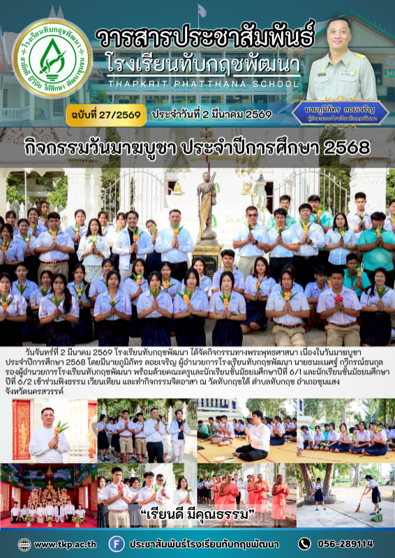 วันจันทร์ที่ 2 มีนาคม 2569 โรงเรียนทับกฤชพัฒนา ได้จัดกิจกรรมทางพระพุทธศาสนา เนื่องในวันมาฆบูชา ประจำปีการศึกษา 2568 โดยมีนายภูมิภัทร ลอยเจริญ ผู้อำนวยการโรงเรียนทับกฤชพัฒนา นายธนะเมศฐ์ กวีกรณ์ธนกุล รองผู้อำนวยการโรงเรียนทับกฤชพัฒนา พร้อมด้วยคณะครูและนักเรียนชั้นมัธยมศึกษาปีที่ 6/1 และนักเรียนชั้นมัธยมศึกษาปีที่ 6/2 เข้าร่วมฟังธรรม เวียนเทียน และทำกิจกรรมจิตอาสา ณ วัดทับกฤชใต้ ตำบลทับกฤช อำเภอชุมแสง จังหวัดนครสวรรค์ |