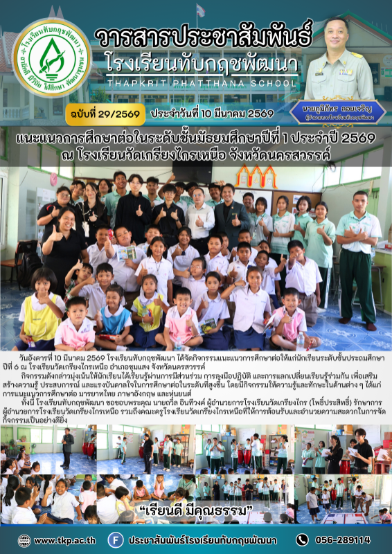 วันอังคารที่ 10 มีนาคม 2569 โรงเรียนทับกฤชพัฒนา ได้จัดกิจกรรมแนะแนวการศึกษาต่อให้แก่นักเรียนระดับชั้นประถมศึกษาปีที่ 6 ณ โรงเรียนวัดเกรียงไกรเหนือ อำเภอชุมแสง จังหวัดนครสวรรค์
