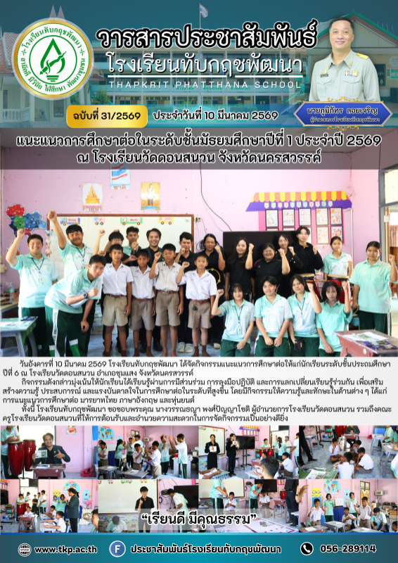 วันอังคารที่ 10 มีนาคม 2569 โรงเรียนทับกฤชพัฒนา ได้จัดกิจกรรมแนะแนวการศึกษาต่อให้แก่นักเรียนระดับชั้นประถมศึกษาปีที่ 6 ณ โรงเรียนวัดดอนสนวน อำเภอชุมแสง จังหวัดนครสวรรค์ กิจกรรมดังกล่าวมุ่งเน้นให้นักเรียนได้เรียนรู้ผ่านการมีส่วนร่วม การลงมือปฏิบัติ และการแลกเปลี่ยนเรียนรู้ร่วมกัน เพื่อเสริมสร้างความรู้ ประสบการณ์ และแรงบันดาลใจในการศึกษาต่อในระดับที่สูงขึ้น โดยมีกิจกรรมให้ความรู้และทักษะในด้านต่าง ๆ ได้แก่ การแนะแนวการศึกษาต่อ มารยาทไทย ภาษาอังกฤษ และหุ่นยนต์ ทั้งนี้ โรงเรียนทับกฤชพัฒนา ขอขอบพระคุณ นางวรรณธญา พงศ์ปัญญาโชติ ผู้อำนวยการโรงเรียนวัดดอนสนวน รวมถึงคณะครูโรงเรียนวัดดอนสนวนที่ให้การต้อนรับและอำนวยความสะดวกในการจัดกิจกรรมเป็นอย่างดียิ่ง |