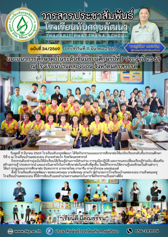 วันพุธที่ 11 มีนาคม 2569 โรงเรียนทับกฤชพัฒนา ได้จัดกิจกรรมแนะแนวการศึกษาต่อให้แก่นักเรียนระดับชั้นประถมศึกษาปีที่ 6 ณ โรงเรียนบ้านคลองบอน อำเภอท่าตะโก จังหวัดนครสวรรค์ กิจกรรมดังกล่าวมุ่งเน้นให้นักเรียนได้เรียนรู้ผ่านการมีส่วนร่วม การลงมือปฏิบัติ และการแลกเปลี่ยนเรียนรู้ร่วมกัน เพื่อเสริมสร้างความรู้ ประสบการณ์ และแรงบันดาลใจในการศึกษาต่อในระดับที่สูงขึ้น โดยมีกิจกรรมให้ความรู้และทักษะในด้านต่าง ๆ ได้แก่ การแนะแนวการศึกษาต่อ นันทนาการ มารยาทไทย ภาษาจีน ภาษาอังกฤษ และหุ่นยนต์ ทั้งนี้ โรงเรียนทับกฤชพัฒนา ขอขอบพระคุณ นายพิเชษฐ เขาแก้ว ผู้อำนวยการโรงเรียนบ้านคลองบอน รวมถึงคณะครูโรงเรียนบ้านคลองบอน ที่ให้การต้อนรับและอำนวยความสะดวกในการจัดกิจกรรมเป็นอย่างดียิ่ง |