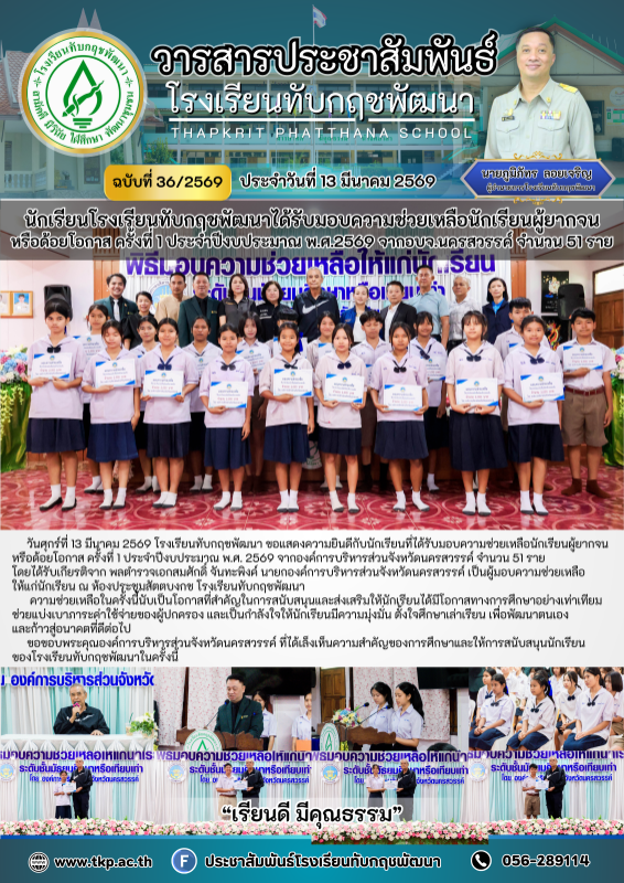 วันศุกร์ที่ 13 มีนาคม 2569 โรงเรียนทับกฤชพัฒนา ขอแสดงความยินดีกับนักเรียนที่ได้รับมอบความช่วยเหลือนักเรียนผู้ยากจนหรือด้อยโอกาส ครั้งที่ 1 ประจำปีงบประมาณ พ.ศ. 2569 จากองค์การบริหารส่วนจังหวัดนครสวรรค์ จำนวน 51 ราย โดยได้รับเกียรติจาก พลตำรวจเอกสมศักดิ์ จันทะพิงค์ นายกองค์การบริหารส่วนจังหวัดนครสวรรค์ เป็นผู้มอบความช่วยเหลือให้แก่นักเรียน ณ ห้องประชุมสัตตบงกช โรงเรียนทับกฤชพัฒนา