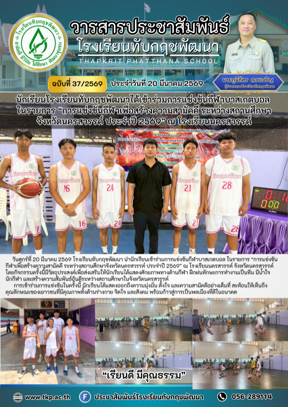 วันศุกร์ที่ 20 มีนาคม 2569 โรงเรียนทับกฤชพัฒนา นำนักเรียนเข้าร่วมการแข่งขันกีฬาบาสเกตบอล ในรายการ “การแข่งขันกีฬาเพื่อสร้างความสามัคคี ระหว่างสถานศึกษาจังหวัดนครสวรรค์ ประจำปี 2569” ณ โรงเรียนนครสวรรค์ จังหวัดนครสวรรค์ โดยกิจกรรมครั้งนี้มีวัตถุประสงค์เพื่อส่งเสริมให้นักเรียนได้แสดงศักยภาพทางด้านกีฬา ฝึกฝนทักษะการทำงานเป็นทีม มีน้ำใจนักกีฬา และสร้างความสัมพันธ์อันดีระหว่างสถานศึกษาในจังหวัดนครสวรรค์