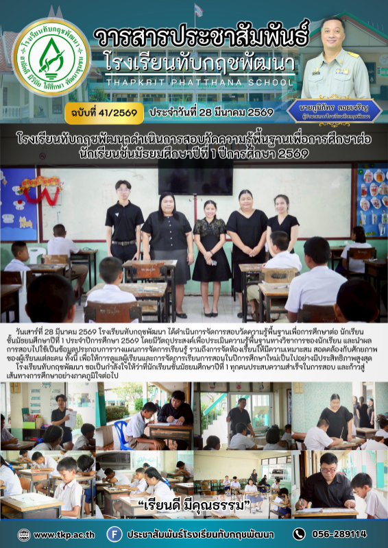 วันเสาร์ที่ 28 มีนาคม 2569 โรงเรียนทับกฤชพัฒนา ได้ดำเนินการจัดการสอบวัดความรู้พื้นฐานเพื่อการศึกษาต่อ นักเรียนชั้นมัธยมศึกษาปีที่ 1 ประจำปีการศึกษา 2569 โดยมีวัตถุประสงค์เพื่อประเมินความรู้พื้นฐานทางวิชาการของนักเรียน และนำผลการสอบไปใช้เป็นข้อมูลประกอบการวางแผนการจัดการเรียนรู้ รวมถึงการจัดห้องเรียนให้มีความเหมาะสม สอดคล้องกับศักยภาพของผู้เรียนแต่ละคน ทั้งนี้ เพื่อให้การดูแลผู้เรียนและการจัดการเรียนการสอนในปีการศึกษาใหม่เป็นไปอย่างมีประสิทธิภาพสูงสุด