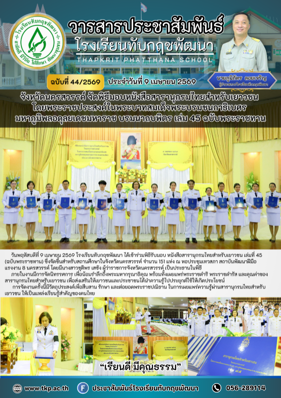 วันพฤหัสบดีที่ 9 เมษายน 2569 โรงเรียนทับกฤชพัฒนา ได้เข้าร่วมพิธีรับมอบ หนังสือสารานุกรมไทยสำหรับเยาวชน เล่มที่ 45 (ฉบับพระราชทาน) ซึ่งจัดขึ้นสำหรับสถานศึกษาในจังหวัดนครสวรรค์ จำนวน 151 แห่ง ณ หอประชุมเทวสภา สถาบันพัฒนาฝีมือแรงงาน 8 นครสวรรค์ โดยมีนางสาวชุติพร เสชัง ผู้ว่าราชการจังหวัดนครสวรรค์ เป็นประธานในพิธี