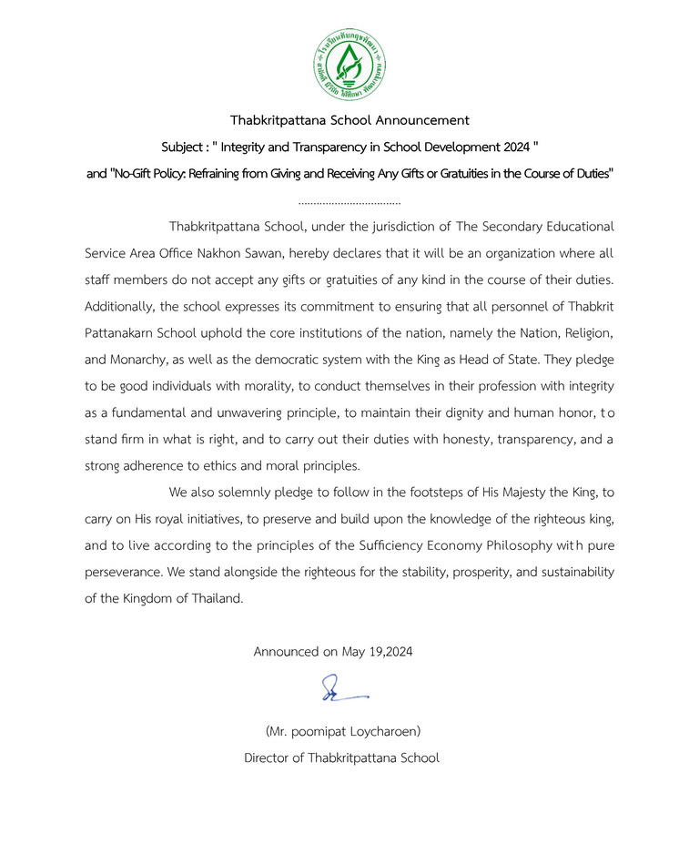 O26 : ประกาศเจตนารมณ์นโยบาย No Gift Policy จากการปฏิบัติหน้าที่