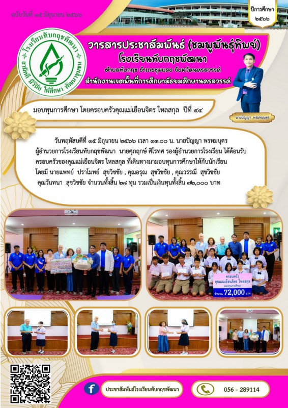 | วันพฤหัสบดีที่ 15 มิถุนายน 2566 เวลา 13.00 น. นายปัญญา พรหมบุตร ผู้อำนวยการโรงเรียนทับกฤชพัฒนา  นายศุภฤกษ์ ศิโรทศรองผู้อำนวยการโรงเรียน ได้ต้อนรับครอบครัวของคุณแม่เยือนจิตร ใหลสกุล ที่เดินทางมามอบทุนการศึกษาจากครอบครัวของ