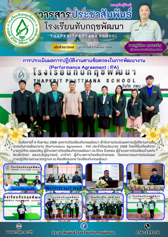 วันอังคารที่ 9 กันยายน 2568 บุคลากรโรงเรียนทับกฤชพัฒนา เข้ารับการประเมินผลการปฏิบัติงานตามข้อตกลงในการพัฒนางาน (Performance Agreement : PA) ประจำปีงบประมาณ 2568 โดยได้รับเกียรติจาก นายภูมิภัทร ลอยเจริญ ผู้อำนวยการโรงเรียนทับกฤชพัฒนา ดร.จิโรจ จิ๋วแหยม ผู้อำนวยการโรงเรียนบ้านแก่งชัชวลิตวิทยา และดร.ธัญญาภรณ์ นาจำปา ผู้อำนวยการโรงเรียนโกรกพระ เป็นคณะกรรมการประเมินผล การปฏิบัติงานตามมาตรฐานฯ ณ ห้องสัตตบงกช โรงเรียนทับกฤชพัฒนา |