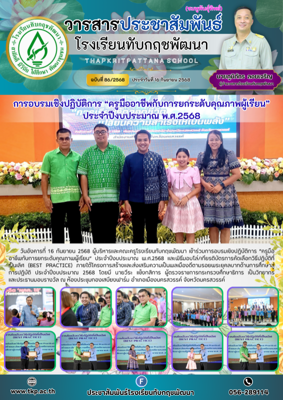 วันอังคารที่ 16 กันยายน 2568 ผู้บริหารและคณะครูโรงเรียนทับกฤชพัฒนา เข้าร่วมการอบรมเชิงปฏิบัติการ “ครูมืออาชีพกับการยกระดับคุณภาพผู้เรียน” ประจำปีงบประมาณ พ.ศ.2568 และพิธีมอบโล่/เกียรติบัตรการคัดเลือกวิธีปฏิบัติที่เป็นเลิศ (BEST PRACTICE) ภายใต้โครงการสร้างและส่งเสริมความเป็นพลเมืองดีตามรอยพระยุคลบาทด้านการศึกษาสู่การปฏิบัติ ประจำปีงบประมาณ 2568 โดยมี นายวีระ แข็งกสิการ ผู้ตรวจราชการกระทรวงศึกษาธิการ เป็นวิทยากร และประธานมอบรางวัล ณ ห้องประชุมกองเสบียงฟาร์ม อำเภอเมืองนครสวรรค์ จังหวัดนครสวรรค์ |