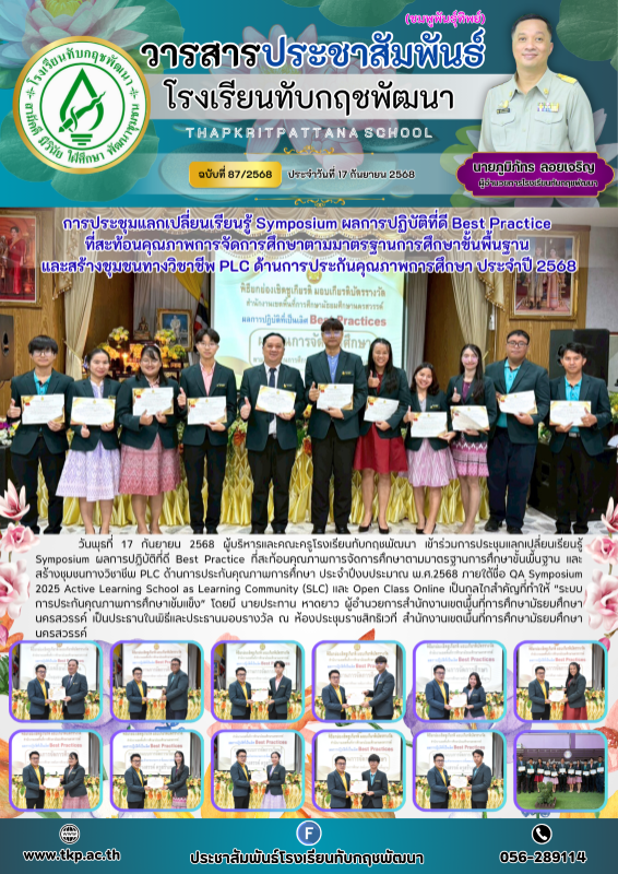วันพุธที่ 17 กันยายน 2568 ผู้บริหารและคณะครูโรงเรียนทับกฤชพัฒนา เข้าร่วมการประชุมแลกเปลี่ยนเรียนรู้ Symposium ผลการปฏิบัติที่ดี Best Practice ที่สะท้อนคุณภาพการจัดการศึกษาตามมาตรฐานการศึกษาขั้นพื้นฐาน และสร้างชุมชนทางวิชาชีพ PLC ด้านการประกันคุณภาพการศึกษา ประจำปีงบประมาณ พ.ศ.2568 ภายใต้ชื่อ QA Symposium 2025 Active Learning School as Learning Community (SLC) และ Open Class Online เป็นกลไกสำคัญที่ทำให้ “ระบบการประกันคุณภาพการศึกษาเข้มแข็ง” โดยมี นายประทาน หาดยาว ผู้อำนวยการสำนักงานเขตพื้นที่การศึกษามัธยมศึกษานครสวรรค์ เป็นประธานในพิธีและประธานมอบรางวัล ณ ห้องประชุมราชสิทธิเวที สำนักงานเขตพื้นที่การศึกษามัธยมศึกษานครสวรรค์ |