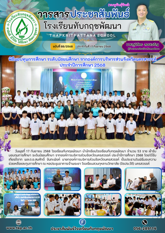วันพุธที่ 17 กันยายน 2568 โรงเรียนทับกฤชพัฒนา นำนักเรียนโรงเรียนทับกฤชพัฒนา จำนวน 53 ราย เข้ารับมอบทุนการศึกษา ระดับมัธยมศึกษา จากองค์การบริหารส่วนจังหวัดนครสวรรค์ ประจำปีการศึกษา 2568 โดยได้รับเกียรติจาก พล.ต.อ.สมศักดิ์ จันทะพิงค์ นายกองค์การบริหารส่วนจังหวัดนครสวรรค์ เป็นประธานในพิธีมอบความช่วยเหลือและทุนการศึกษา ณ หอประชุมอาคารเจ้าพระยา โรงเรียนสวนกุหลาบวิทยาลัย (จิรประวัติ) นครสวรรค์ |