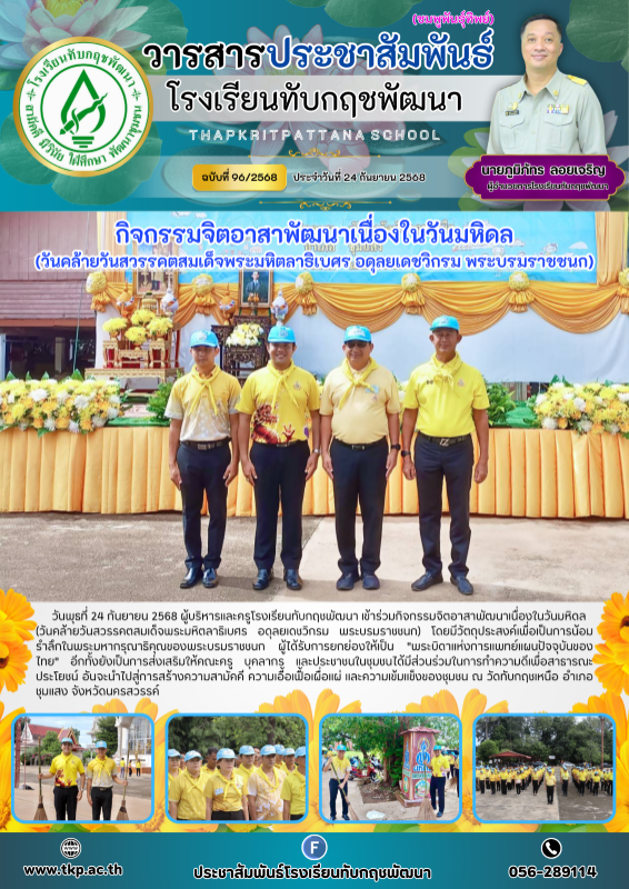 วันพุธที่ 24 กันยายน 2568 ผู้บริหารและครูโรงเรียนทับกฤชพัฒนา เข้าร่วมกิจกรรมจิตอาสาพัฒนาเนื่องในวันมหิดล (วันคล้ายวันสวรรคตสมเด็จพระมหิตลาธิเบศร อดุลยเดชวิกรม พระบรมราชชนก) โดยมีวัตถุประสงค์เพื่อเป็นการน้อมรำลึกในพระมหากรุณาธิคุณของพระบรมราชชนก ผู้ได้รับการยกย่องให้เป็น "พระบิดาแห่งการแพทย์แผนปัจจุบันของไทย" อีกทั้งยังเป็นการส่งเสริมให้คณะครู บุคลากร และประชาชนในชุมชนได้มีส่วนร่วมในการทำความดีเพื่อสาธารณะประโยชน์ อันจะนำไปสู่การสร้างความสามัคคี ความเอื้อเฟื้อเผื่อแผ่ และความเข้มแข็งของชุมชน ณ วัดทับกฤชเหนือ อำเภอชุมแสง จังหวัดนครสวรรค์ |