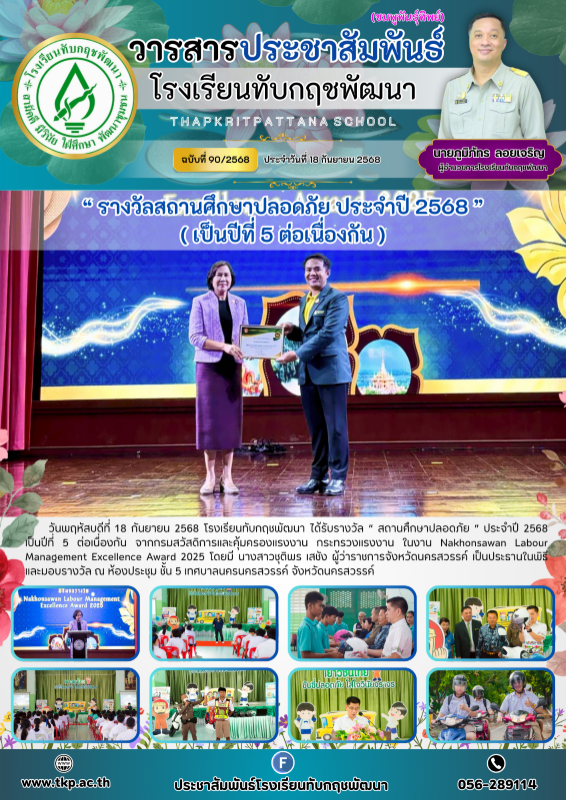 วันพฤหัสบดีที่ 18 กันยายน 2568 โรงเรียนทับกฤชพัฒนา ได้รับรางวัล “ สถานศึกษาปลอดภัย ” ประจำปี 2568 เป็นปีที่ 5 ต่อเนื่องกัน จากกรมสวัสดิการและคุ้มครองแรงงาน กระทรวงแรงงาน ในงาน Nakhonsawan Labour Management Excellence Award 2025 โดยมี นางสาวชุติพร เสชัง ผู้ว่าราชการจังหวัดนครสวรรค์ เป็นประธานในพิธีและมอบรางวัล ณ ห้องประชุม ชั้น 5 เทศบาลนครนครสวรรค์ จังหวัดนครสวรรค์ |