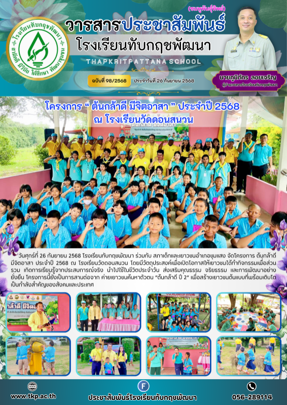 วันศุกร์ที่ 26 กันยายน 2568 โรงเรียนทับกฤชพัฒนา ร่วมกับ สภาเด็กและเยาวชนอำเภอชุมแสง จัดโครงการ ต้นกล้าดี มีจิตอาสา ประจำปี 2568 ณ โรงเรียนวัดดอนสนวน โดยมีวัตถุประสงค์เพื่อเปิดโอกาสให้เยาวชนได้ทำกิจกรรมเพื่อส่วนรวม เกิดการเรียนรู้จากประสบการณ์จริง นำไปใช้ในชีวิตประจำวัน ส่งเสริมคุณธรรม จริยธรรม และการพัฒนาอย่างยั่งยืน โครงการนี้ยังเป็นการสานต่อจาก ค่ายเยาวชนค้นหาตัวตน “ต้นกล้าดี ปี 2” เพื่อสร้างเยาวชนต้นแบบที่พร้อมเติบโตเป็นกำลังสำคัญของสังคมและประเทศ |