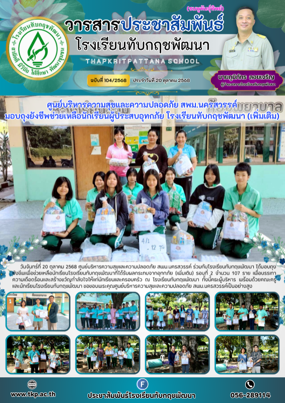 ศูนย์บริหารความสุขและความปลอดภัย สพม.นครสวรรค์ มอบถุงยังชีพช่วยเหลือนักเรียนผู้ประสบอุทกภัย โรงเรียนทับกฤชพัฒนา (เพิ่มเติม) รอบที่ 2