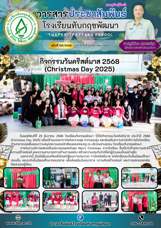 วันพฤหัสบดีที่ 25 ธันวาคม 2568 โรงเรียนทับกฤชพัฒนา ได้จัดกิจกรรมวันคริสต์มาส ประจำปี 2568 (Christmas Day 2025) เพื่อสร้างบรรยากาศแห่งความสุข ความอบอุ่น และส่งเสริมความสามัคคีภายในโรงเรียน ท่ามกลางรอยยิ้มและความสนุกสนานของนักเรียนและคณะครู ณ บริเวณลานธรรม โรงเรียนทับกฤชพัฒนา