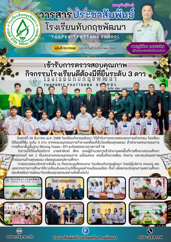วันศุกร์ที่ 26 ธันวาคม พ.ศ. 2568 โรงเรียนทับกฤชพัฒนา ได้เข้ารับการตรวจสอบคุณภาพกิจกรรม โรงเรียนดีต้องมีที่ยืน ระดับ 3 ดาว จากคณะอนุกรรมการทำงานเคลื่อนที่เร็วโรงเรียนคุณธรรม สำนักงานคณะกรรมการการศึกษาขั้นพื้นฐาน (Roving Teams : RT) ระดับเขตตรวจราชการที่ 18